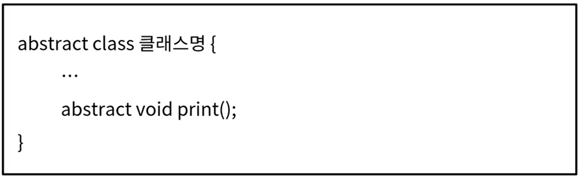 자식클래스에서 반드시 오버라이딩 해야하는 메소드. 선언만 하고 구현 내용은 없음
