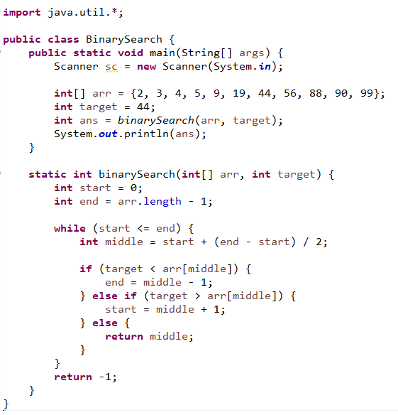 System.out.println("Index : " + binarySearch2(arr, 20, 0, arr.length -1));