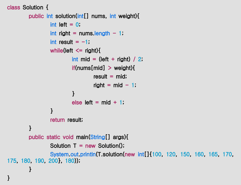 찾고자 하는 값보다 큰 것 중에서 가장 작은 값을 찾아주는 이분검색방법