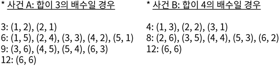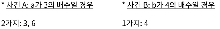 - 예시 1 ) 두 개의 주사위 a, b를 던졌을 때 a는 3의 배수, b는 4의 배수인 경우의 수
