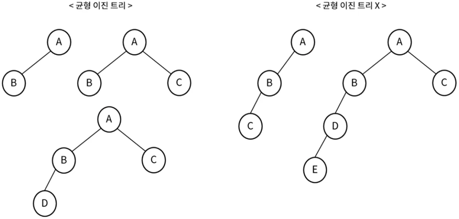 - 균형 이진 트리 (Balanced Binary Tree) : 모든 노드의 좌우 서브 트리 높이가 1 이상 차이 나지 않는 트리